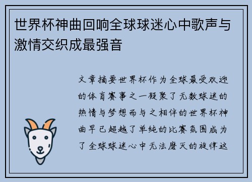 2004年世界杯主题曲《激情与梦想交织的旋律,点燃足球狂热的永恒回响》不仅是一首音乐作品,更是全球足球文化的一部分。作为一项历史悠久且备受关注的世界级赛事,世界杯不仅通过球场上的激烈对抗吸引了亿万观众...